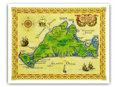 Beautiful 8 x 6.25 inch framable antique-looking map of Martha's Vineyard, Massachusetts. Featuring all seven towns: Vineyard Haven(Tisbury), Oak Bluffs, Edgartown, West Tisbury, Chilmark, Aquinnah. Also has five of Island's Lighthouses. Printed on heavy stock.